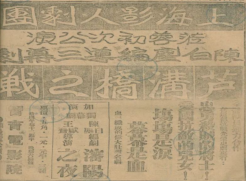 上海影人劇團《盧溝橋之戰(zhàn)》廣告 圖據(jù)新明電影院成都電影輕博物館
