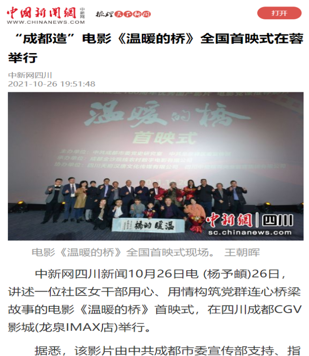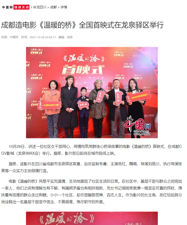 | 2 | 成都造電影《溫暖的橋》全國首映式在龍泉驛區(qū)舉行 | http://sc.china.com.cn/2021/difang/1325/1026/424065.html | 中國網 | 網絡 | 央媒 |