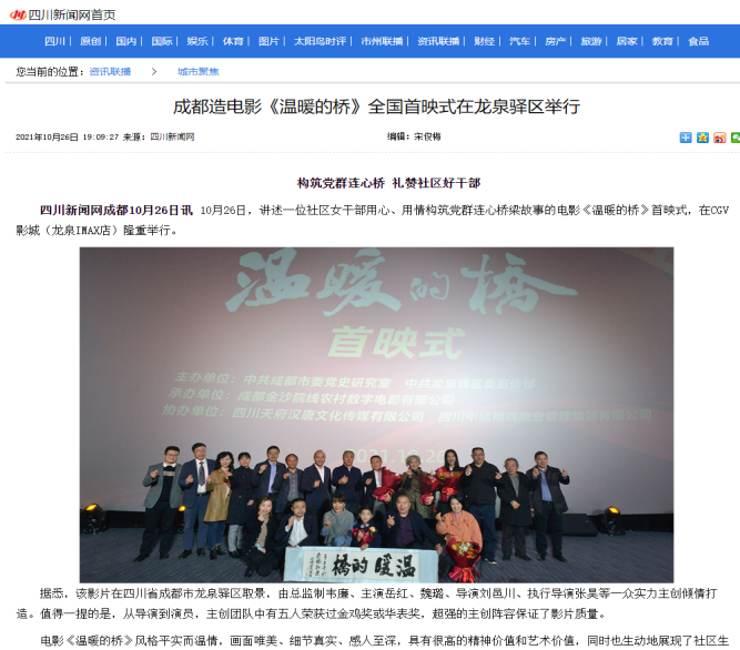 | 4 | 成都造電影《溫暖的橋》全國首映式在龍泉驛區(qū)舉行 | http://city.newssc.org/system/20211026/003213628.htm | 四川新聞網 | 網絡 | 省媒 |